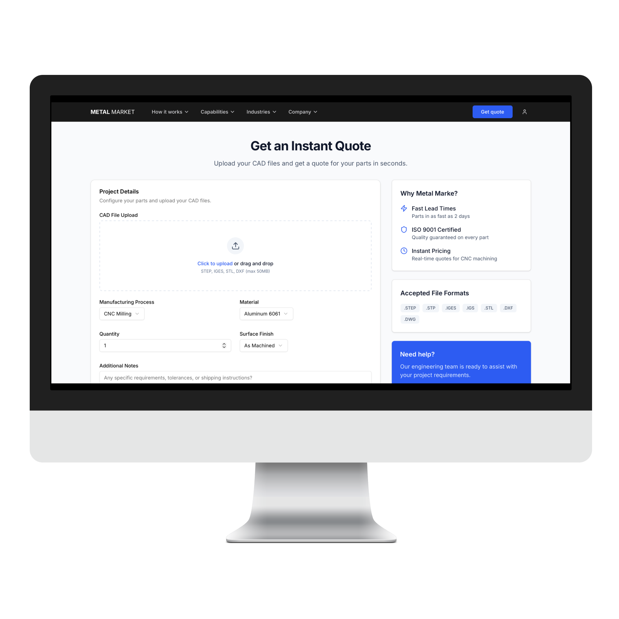 Metal Market is a first in the world, made in India. We are the only manufacturing platform that owns in-house factories and also works with a trusted Indian supplier network. You can use Metal Market factories to produce high-quality parts faster, or use the Metal Market Network to get lower pricing for bulk orders, high precision, and complex part manufacturing. The result? Smart digital manufacturing and engineering support for everything you need from early prototypes to large-scale production, delivered anywhere in the world.